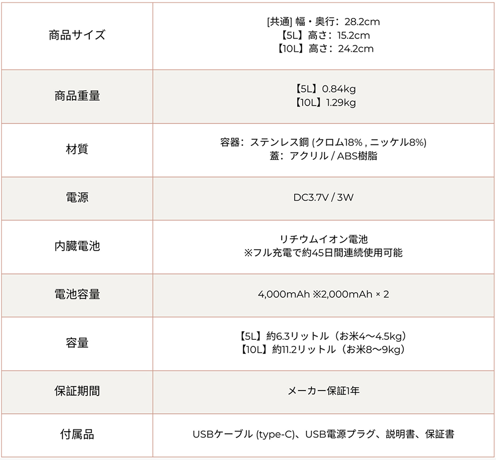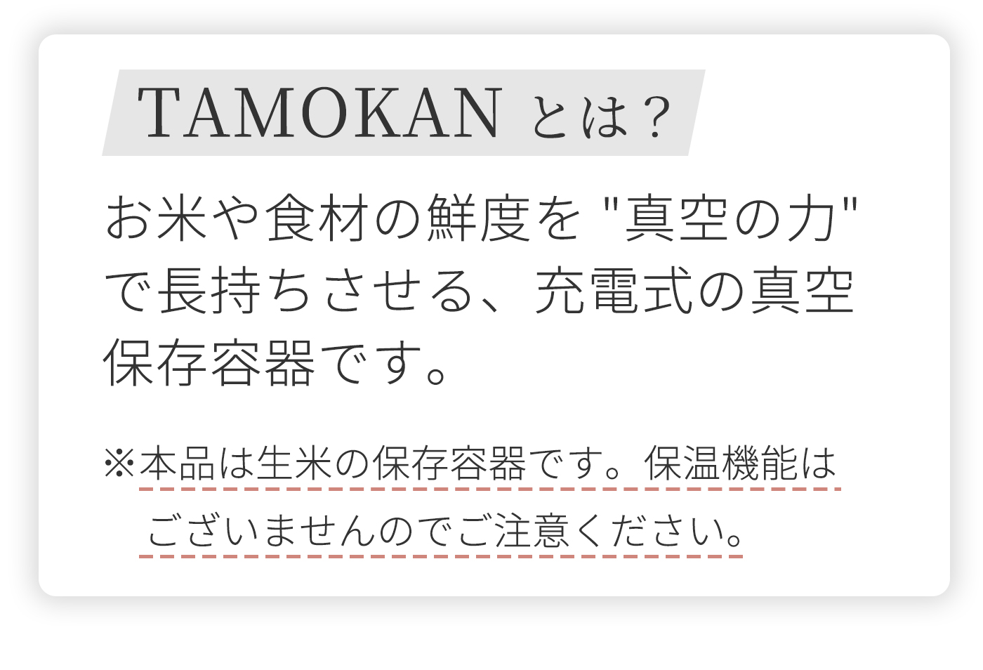 TAMOKAN 10リットル容器の容量は、お米約8〜9kg程度です。 ※真空保存米びつTAMOKANは生米の保存容器です。保温機能はございませんのでご注意ください。