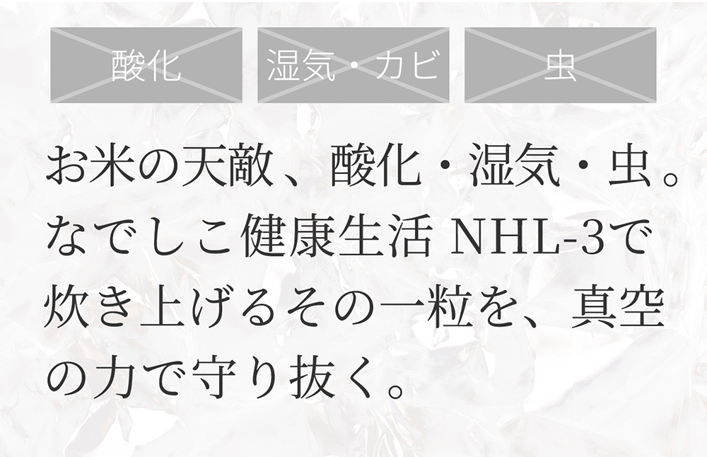 TAMOKANは、玄米の豊かな風味や栄養を損なわないよう、空気を抜いて大切に守り抜きます。 お米の質を落とさない。なでしこ健康生活 NHL-3 で炊くお米の美味しさを陰で支えます。