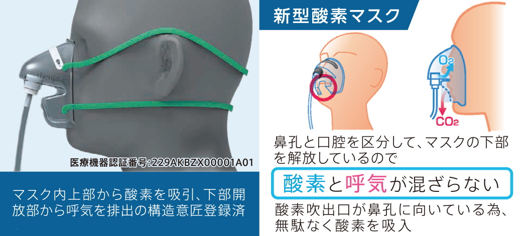 2018年5月28日改良した新型コネクターでの認証を取得。供給される酸素が鼻に直接向かう事で、目尻方向への酸素漏れや酸素の拡散を防ぐ為、高濃度の酸素を効率的に吸引できます。